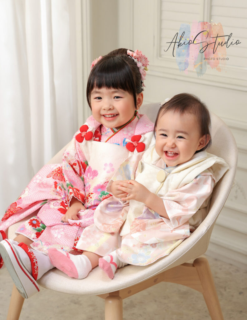 次に和装での撮影では、姉妹での素敵なショットが実現しました。ピンク地に花柄が美しい着物と、淡い色合いの被布姿。姉妹の笑顔があまりにも自然で、この瞬間を写真に収められたことを本当に嬉しく思います。