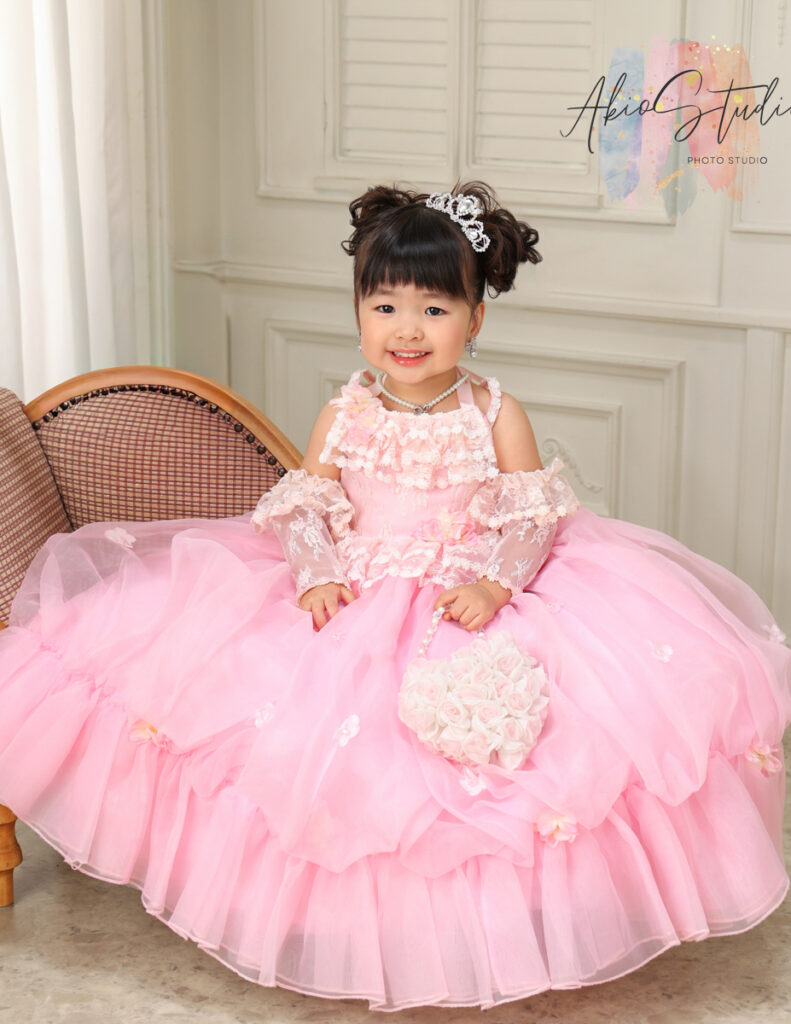 最初にお選びいただいたのは、ふんわりとした桜色のドレス。お子様の可愛らしさを引き立てています。華やかな雰囲気に仕上がりました。