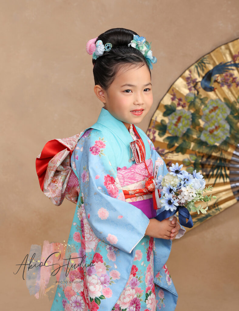 爽やかな水色の着物は、春の空のように明るく澄んだ印象を与えてくれます。花々が描かれた着物の細部まで丁寧に着付けされており、帯の結びや小物の配置にもこだわりが感じられます。お子様に寄り添ったヘアセットも、その日の主役にふさわしい華やかさ。特に髪飾りの色合いと着物の水色のコントラストが絶妙で、写真全体に統一感を生み出しています。