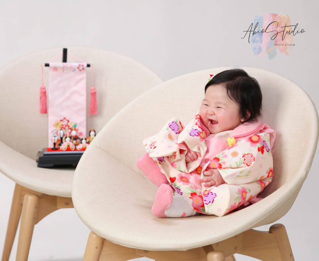 お椅子に座って、溢れんばかりのこの笑顔! 後ろの吊るし飾りとお嬢様の朗らかな表情が重なって、見ている私たちまで幸せな気持ちになりますね。健やかな成長を願う、一生に一度の素敵な記念になりました。