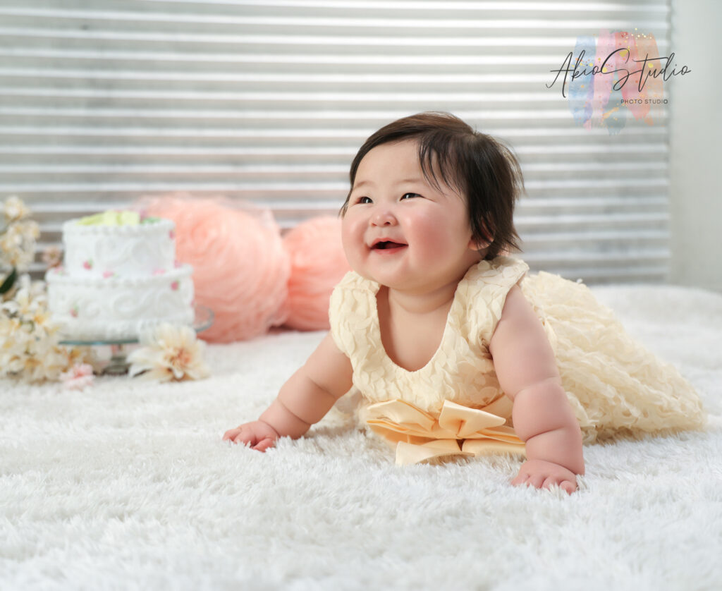 クリーム色のフリルドレスにお着替えして、うつ伏せポーズに挑戦! 生後半年ならではの、ムチムチとした可愛らしい腕や、キラキラとした瞳がたまりません。 隣に置かれたバースデーケーキと一緒に、今の時期だけの「可愛らしさ」をぎゅっと詰め込みました。